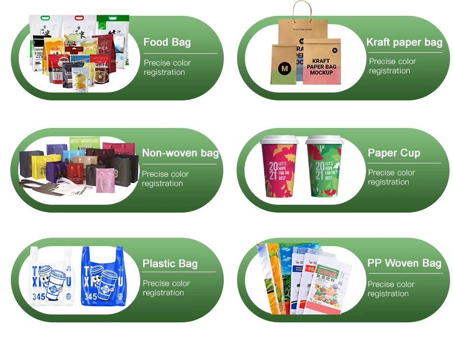 Поддерживает полноцветную 6-цветную печать со сверхточной регистрацией цветов (±0,1 мм), обеспечивая четкую графику, яркие узоры и равномерное покрытие чернил для высококачественной упаковки.